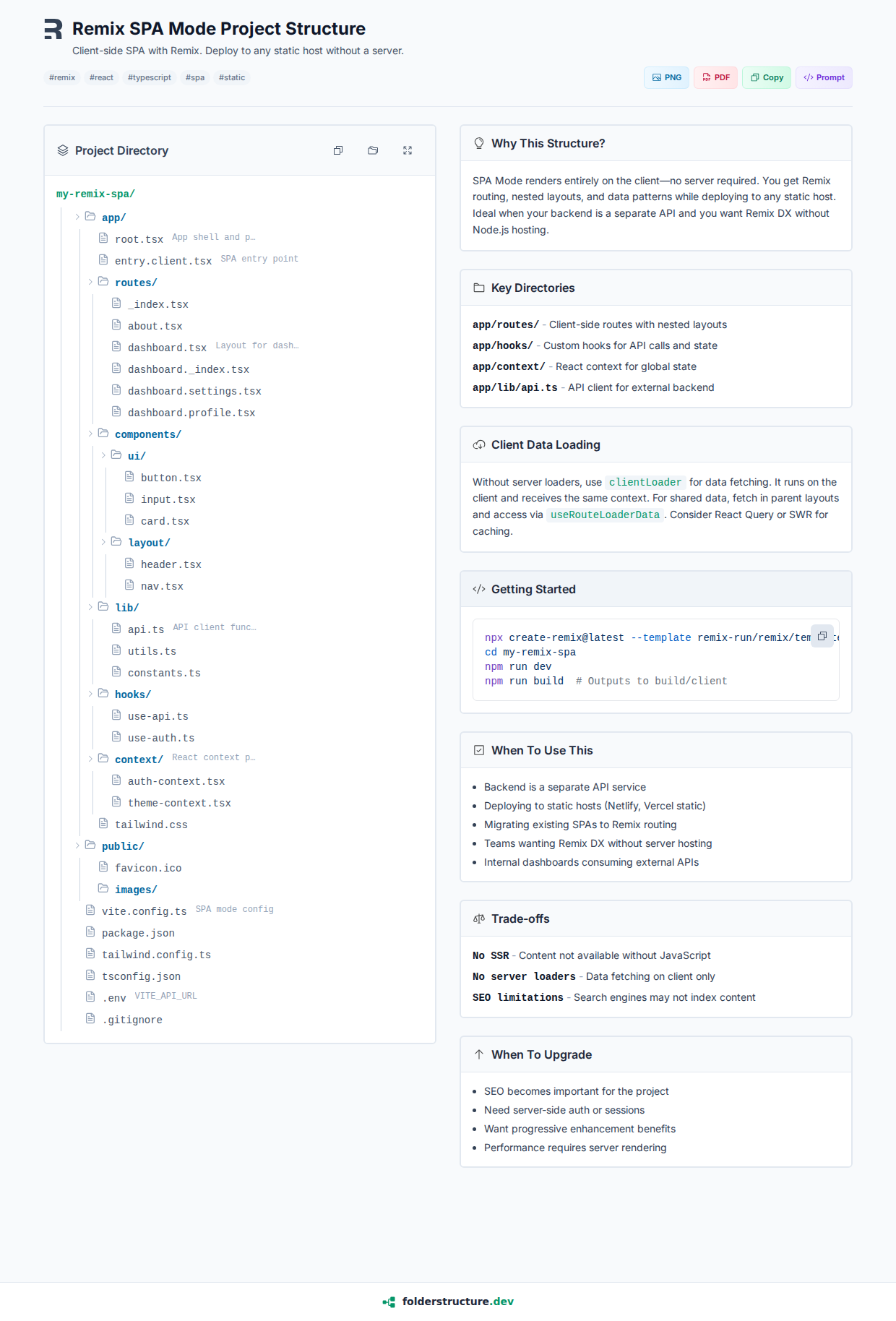 Client-side SPA with Remix. Deploy to any static host without a server.
