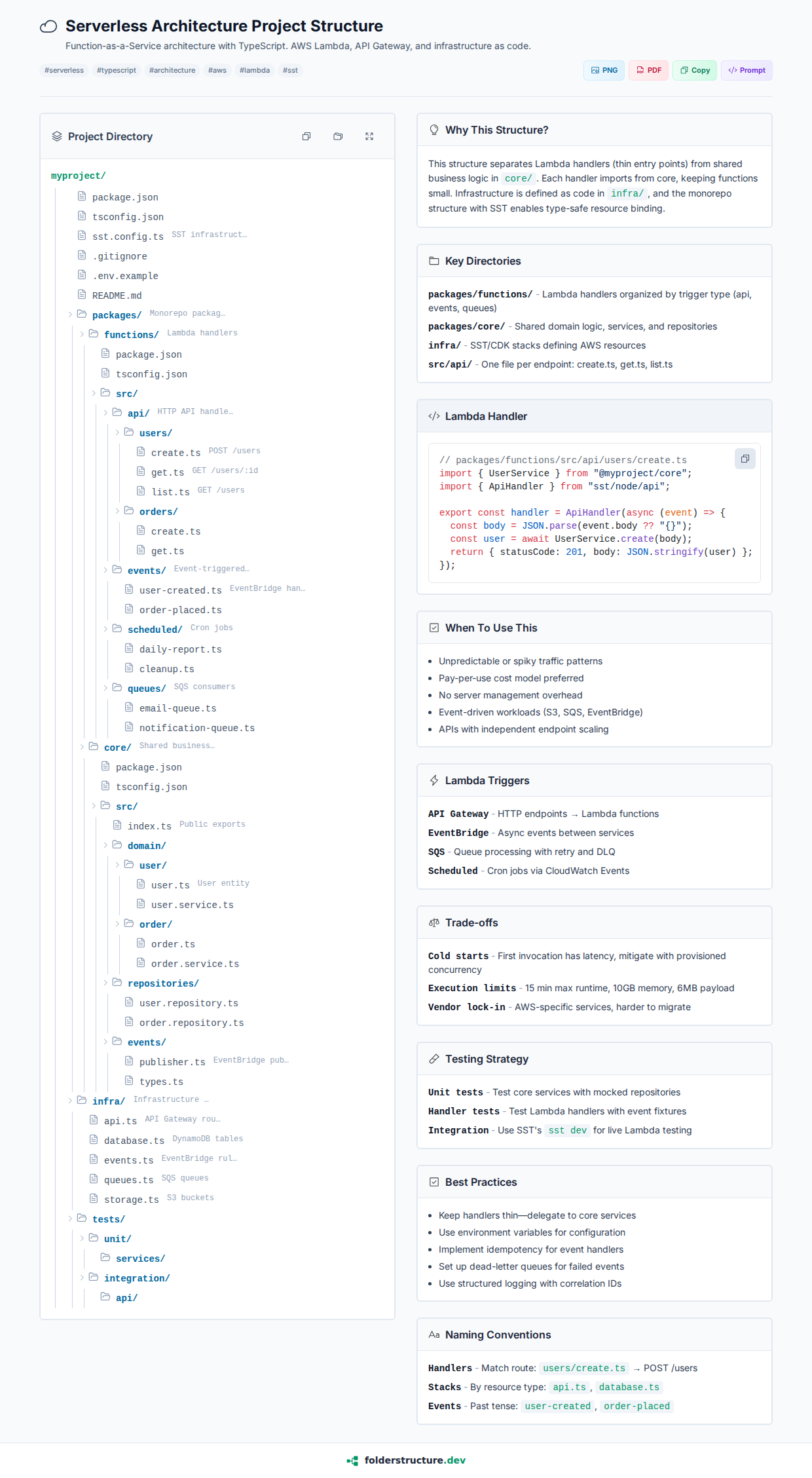 This structure separates Lambda handlers (thin entry points) from shared business logic in core/. Each handler imports from core, keeping functions small. Infrastructure is defined as code in infra/, and the monorepo structure with SST enables type-safe resource binding.