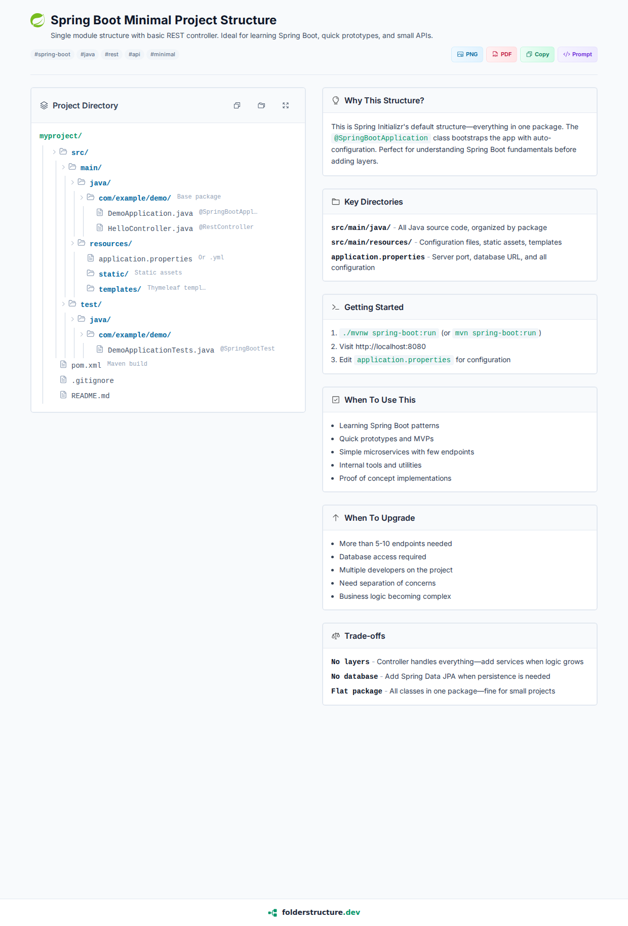 Single module structure with basic REST controller. Ideal for learning Spring Boot, quick prototypes, and small APIs.
