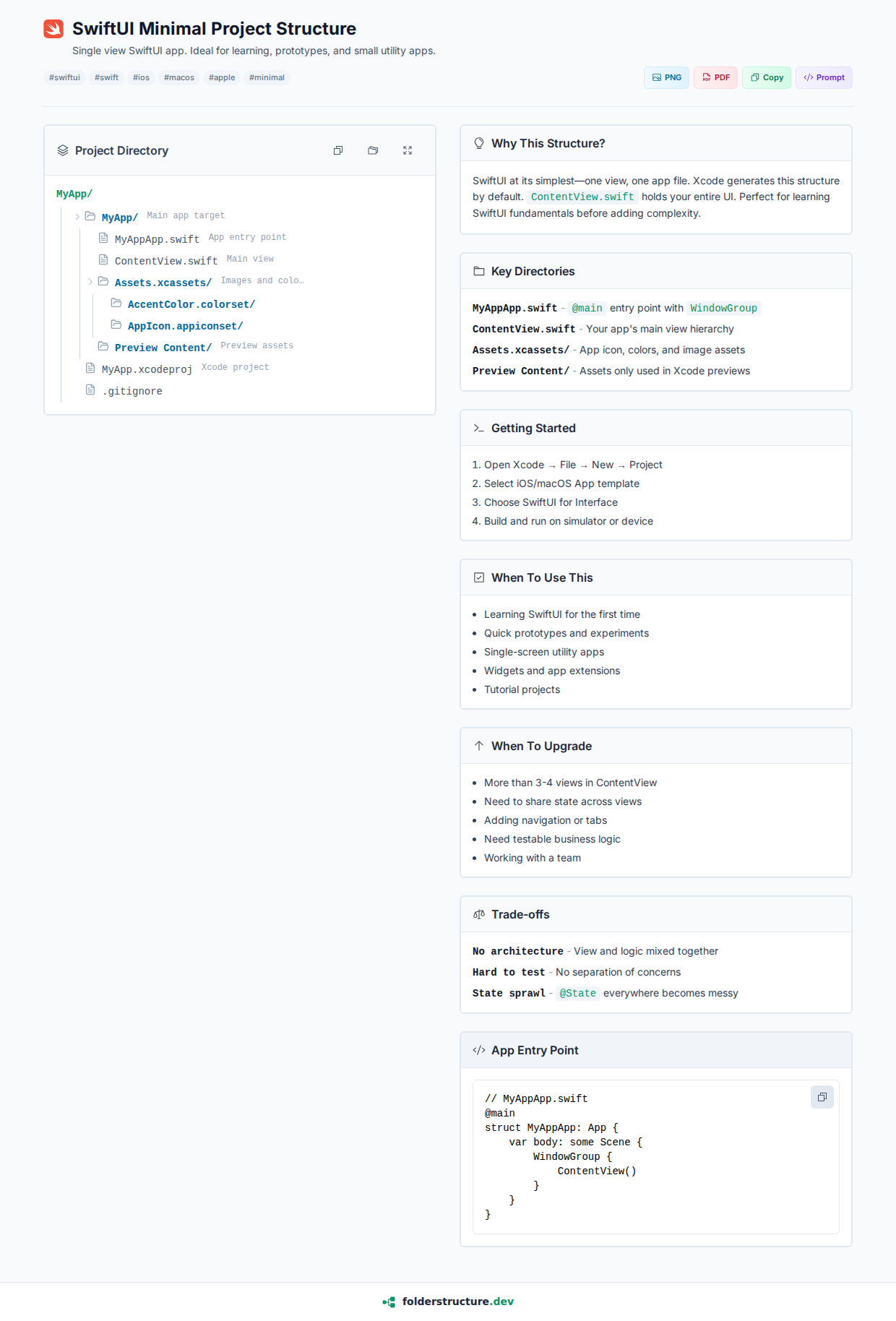 Single view SwiftUI app. Ideal for learning, prototypes, and small utility apps.