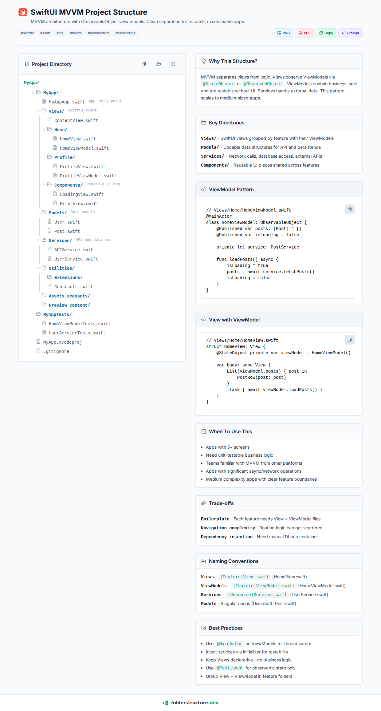 MVVM architecture with ObservableObject view models. Clean separation for testable, maintainable apps.