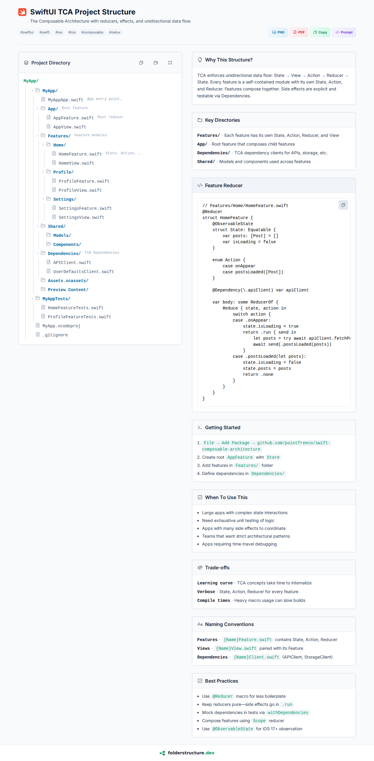 TCA enforces unidirectional data flow: State → View → Action → Reducer → State. Every feature is a self-contained module with its own State, Action, and Reducer. Features compose together. Side effects are explicit and testable via Dependencies.
