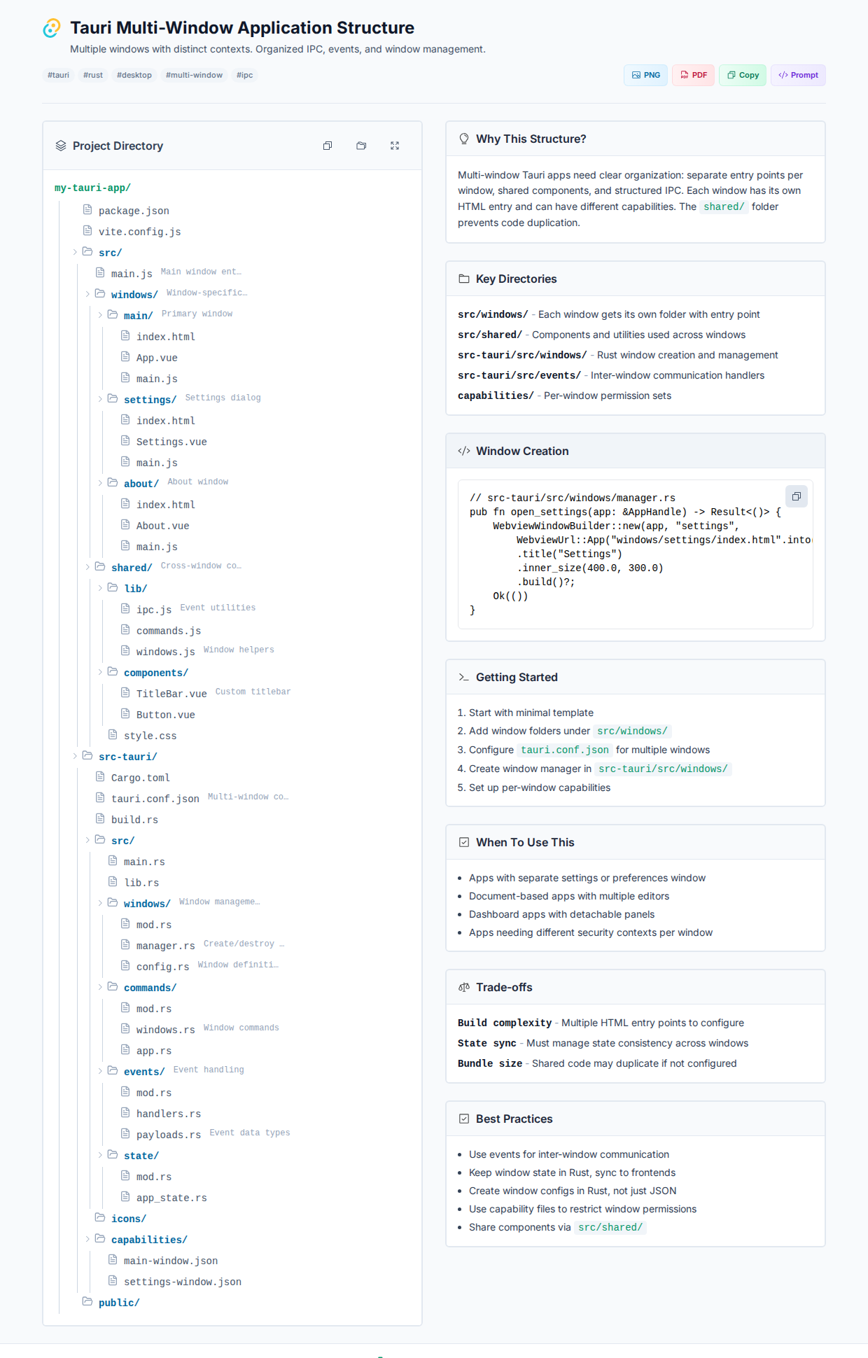 Multi-window Tauri apps need clear organization: separate entry points per window, shared components, and structured IPC. Each window has its own HTML entry and can have different capabilities. The shared/ folder prevents code duplication.
