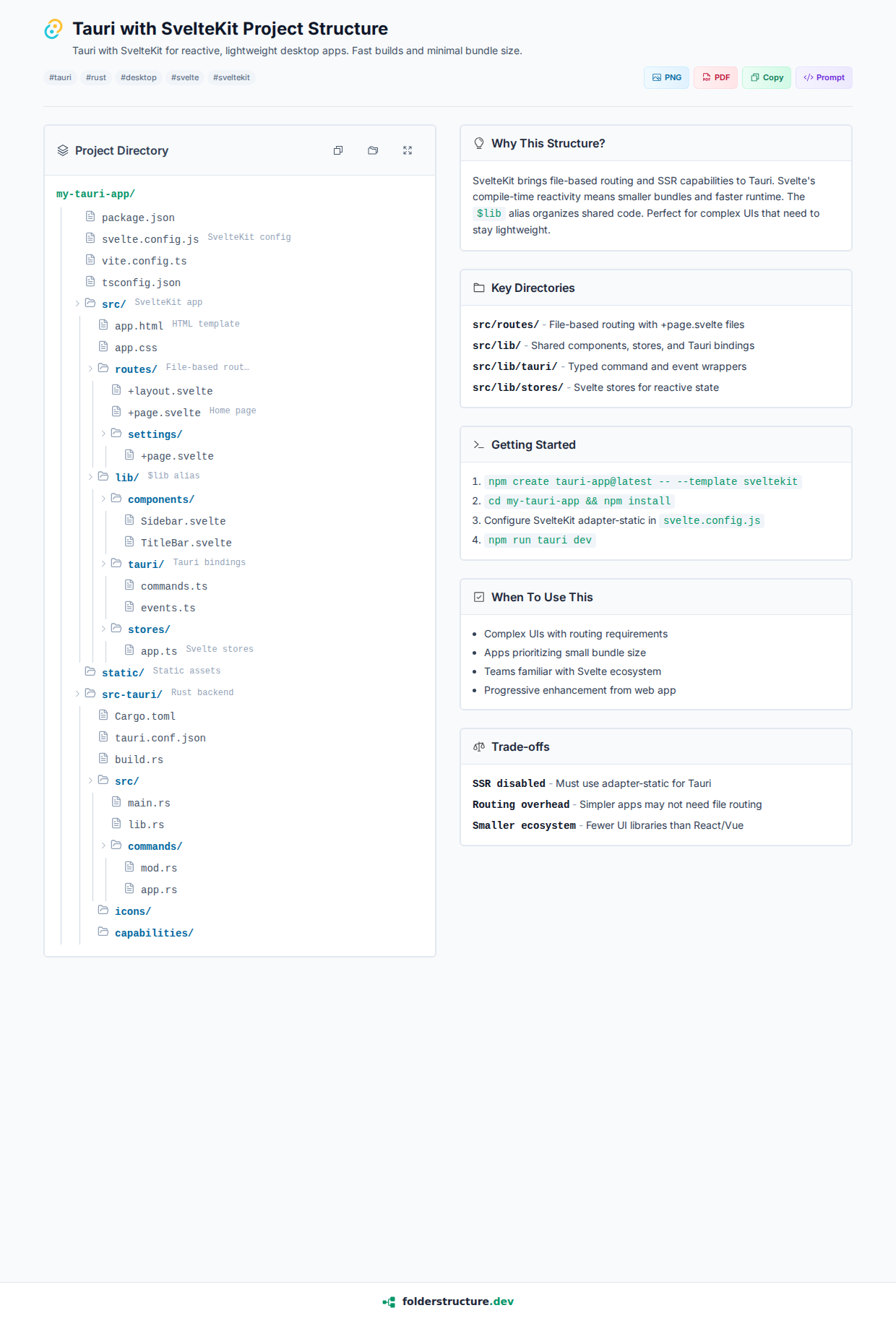 SvelteKit brings file-based routing and SSR capabilities to Tauri. Svelte's compile-time reactivity means smaller bundles and faster runtime. The $lib alias organizes shared code. Perfect for complex UIs that need to stay lightweight.