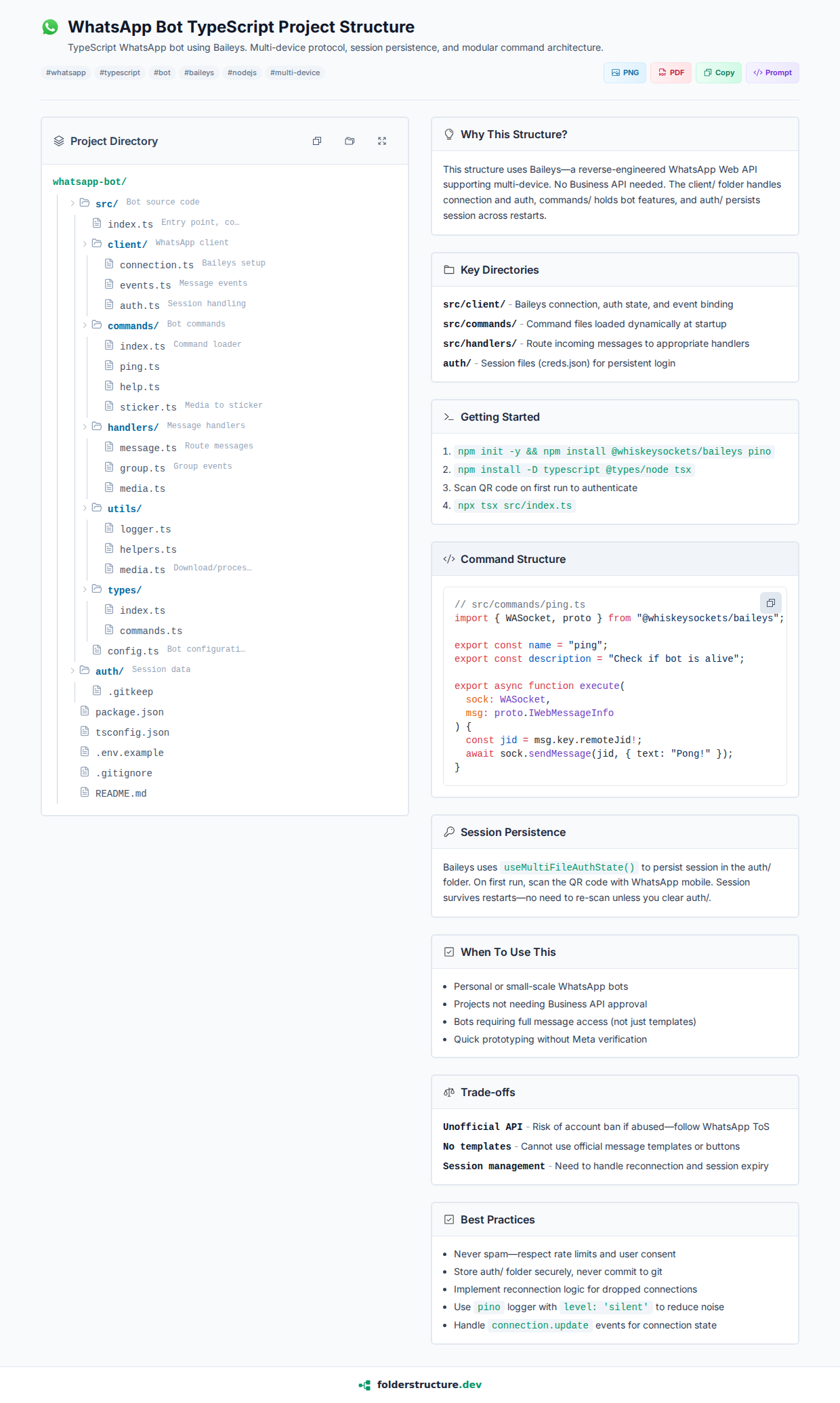 This structure uses Baileys—a reverse-engineered WhatsApp Web API supporting multi-device. No Business API needed. The client/ folder handles connection and auth, commands/ holds bot features, and auth/ persists session across restarts.